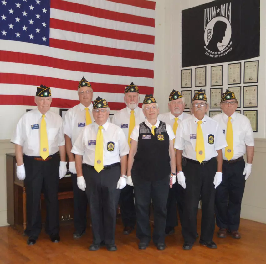 Some of the members of Keesler-Hamrick-Gillespie American Legion Post 29’s honor guard are, from left, John Gewalt, Dave Becker, Johnny Favara, Gary McDonald, Anita Batman, Bobby Grantham, Steven Hambrick and Donny Whitehead. Post 29 celebrated 100 years on Friday.