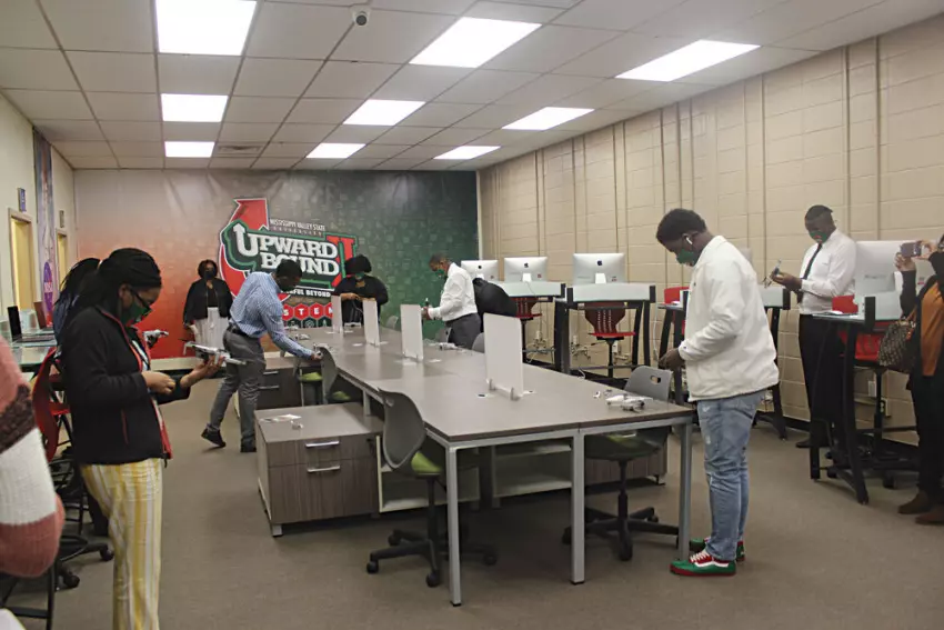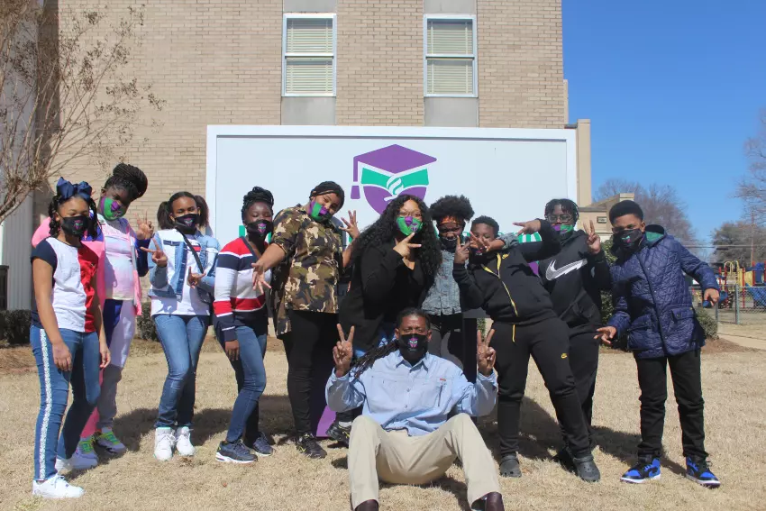 Sixth graders at Leflore Legacy Academy celebrate at the end of a Saturday event that featured tips on how to practice conflict resolution. From left are Aeriel Holmes, Makiya Durant, Amyreia Anderson, Keiristyn Ivory, Synia Tate, Leflore Legacy’s college and career counselor Kiara Williams, Madison Streeter, TaQuerian Ollie, Trevor Roach and Eric Chandler Jr. In front is Shun Pearson, a consultant who works with at-risk youth. He led Saturday’s event.