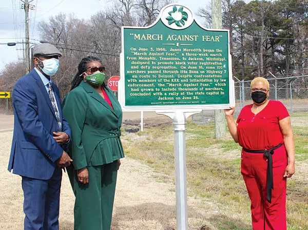 A historical marker is unveiled in Itta Bena Thursday on Mississippi 7 South, on which civil rights activists marched to Belzoni. From left are Al White, a faculty member of Mississippi Valley State University’s mass communication department; Dr. Carolyn Gordon, an associate professor in that department; and Shannon Bowden, an instructor in speech and mass communication.
