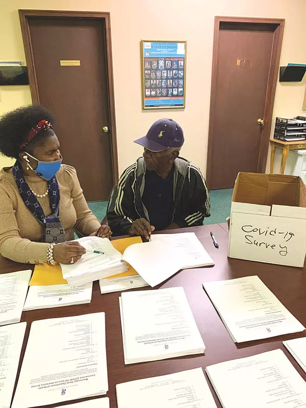 Freddie White-Johnson, left, the founder and president of the Fannie Lou Hamer Cancer Foundation, and Verbain Foreman Sr. are two volunteers who distribute the state Health Department’s survey assessing Mississippians’ thoughts on the COVID-19 vaccine.
