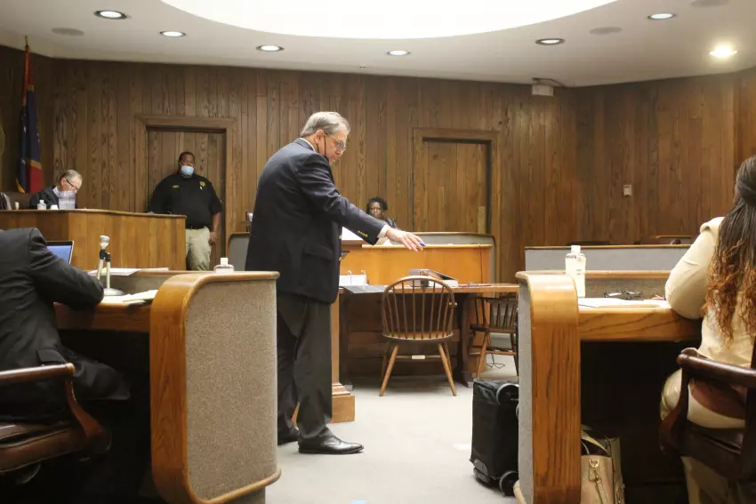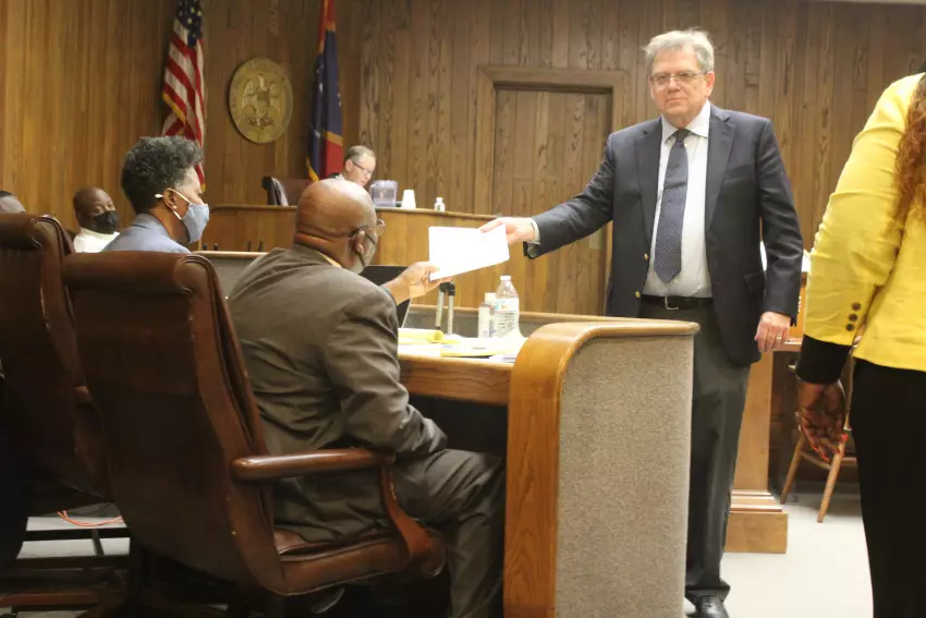 From left, Kimberly Jones Merchant and Willie Griffin, attorneys for Itta Bena Mayor Reginald Freeman, receive a document from Samuel L. Begley, attorney for Patricia Young, during a trial at the Leflore County Courthouse Tuesday. Young, who placed second to Freeman in the race for mayor earlier this summer, is challenging the results. The trial for Young’s election contest started Monday and will continue at 9 a.m. Wednesday. (By Gerard Edic)
