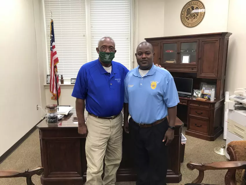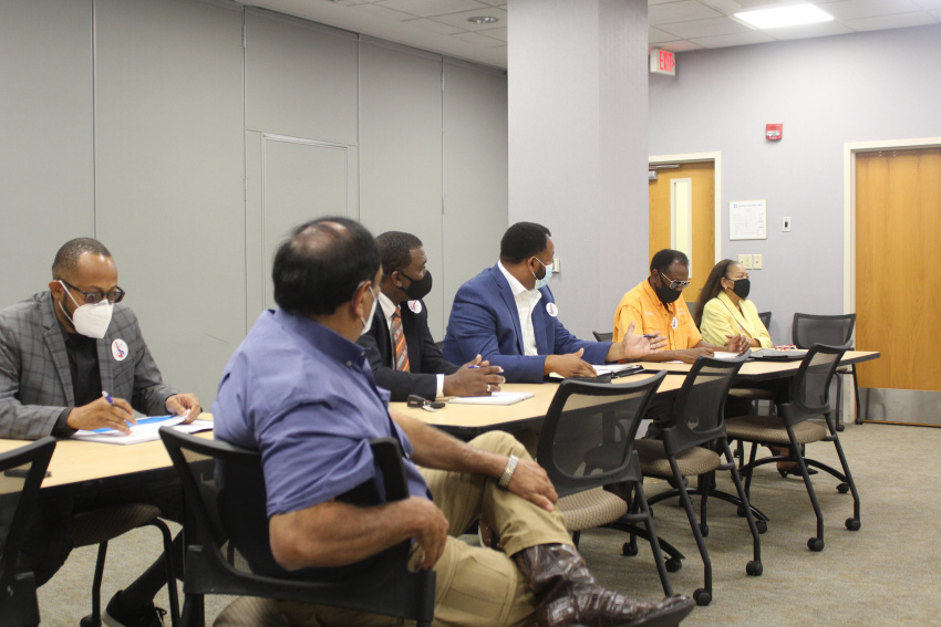 Members of the Leflore County Board of Supervisors and other county officials attend Wednesday’s special called Greenwood Leflore Hospital board meeting at the hospital in an attempt to address their concerns about the hospital. In the forefront is District 1 Supervisor Sam Abraham. At the back, from left, are board president Reginald Moore, Chancery Clerk Johnny Gary, District 4 Supervisor Eric Mitchell, District 5 Supervisor Robert Collins and Joyce Chiles, the attorney for the supervisors. (By Gerard Edic)
