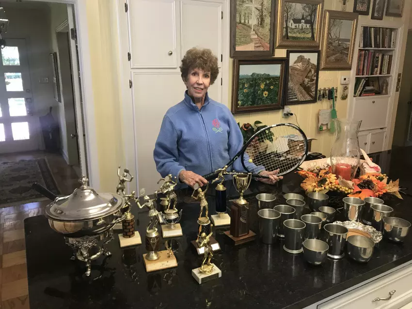 At the age of 80, Greenwood resident Rose Bowman is staying active playing tennis and doing water aerobics exercises to keep healthy despite several surgeries, hip replacements and arthritis. She’s pictured above with dozens of trophies from over the years. (By Riley Overend)