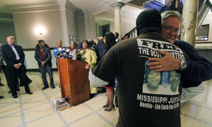 Supporters hug Thursday at a news conference at the Capitol in Jackson about the pending release of sisters Gladys and Jamie Scott. Gov. Haley Barbour has suspended the life sentences of the two women, but he has conditioned Gladys Scott's release on her donating one of her kidneys to her sister, who requires daily dialysis. Copyright 2010 Associated Press. All rights reserved. This material may not be published, broadcast, rewritten or redistributed.