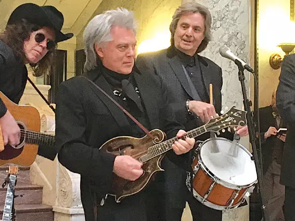 Country singer Marty Stuart, center, performs at the Mississippi Capitol in Jackson on Wednesday, Jan. 31, 2018. Also shown are two members of his band, The Fabulous Superlatives. Harry Stinson is behind Stuart and Chris Scruggs is on the right. Stuart says he is planning to develop a museum called Marty Stuart's Congress of Country Music in his hometown of Philadelphia, Miss.( AP Photo/Emily Wagster Pettus)