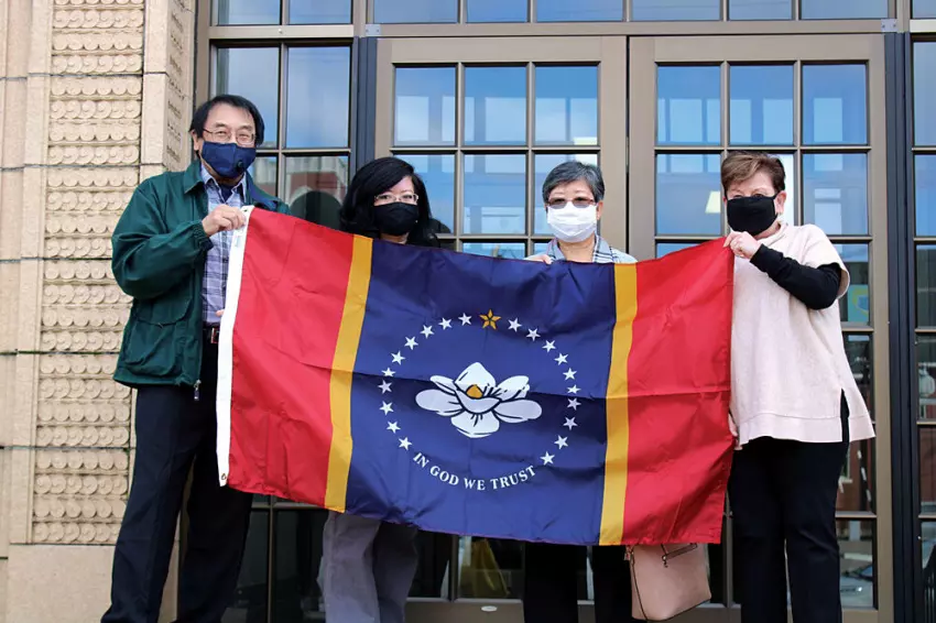 The family of Sue Anna Joe, the Greenwood native who designed the magnolia flower seen on the new Mississippi flag, and the Mississippi Delta Chinese Heritage Museum in Cleveland gifted a new state flag to Greenwood City Hall on Monday. Joe could not be in attendance for the presentation as she now lives in San Francisco. “I’m just delighted that not only do we have a new state flag but that it was designed, in part, by a member from our community,” Mayor Carolyn McAdams said. Mississippi voters approved the new design in November, but it still has to be officially adopted by the Mississippi Legislature, which convenes Tuesday. From left are Harry Gong, treasurer of the Mississippi Delta Chinese Heritage Museum; Belinda Joe Marriott, Sue Anna Joe’s sister; Miuyin “Maria” Joe, Sue Anna Joe’s mother; and McAdams.