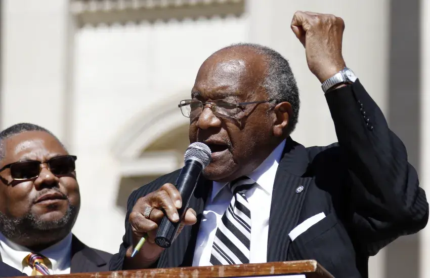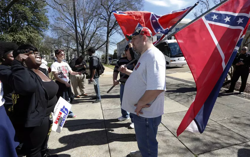 Wanda Bingham of Laurel, left, who supports the removal of the Confederate battle emblem from the Mississippi flag, argues with Craig Haden of Braxton, who wants to keep the emblem on the flag, following a rally to remove the emblem at the state Capitol in Jackson last week.