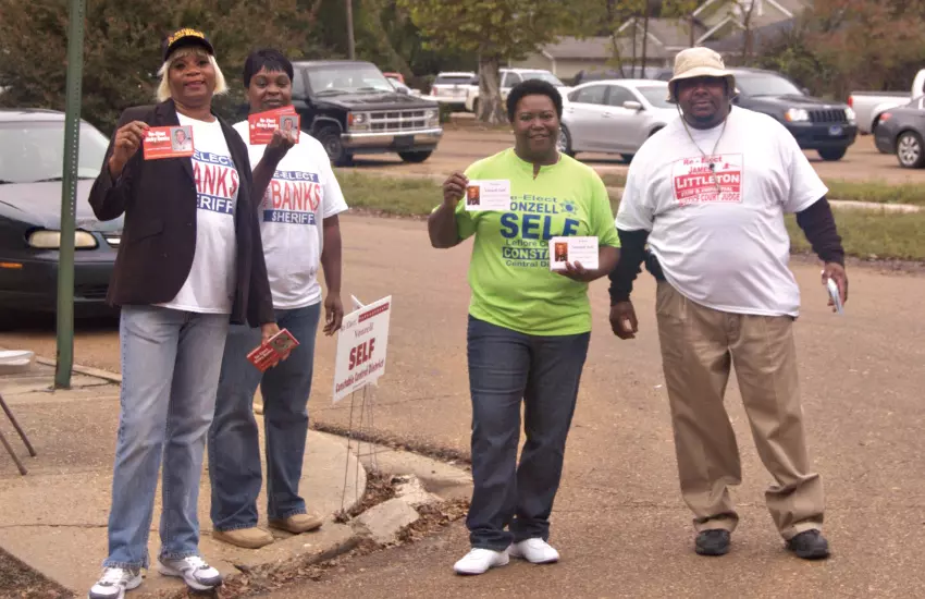 From left, Bermeal Ross, Trena Davis, Bridgett Carpenter and Darrell Edwards help get the vote out this morning for Sheriff Ricky Banks, Constable Vonzell Self, Central District Justice Court Judge James Littleton and Initiative 42 at the corner of Cotton and West Market streets. Mississippians are electing statewide officials and all members of the Legislature. The polls will be open until 7 p.m.