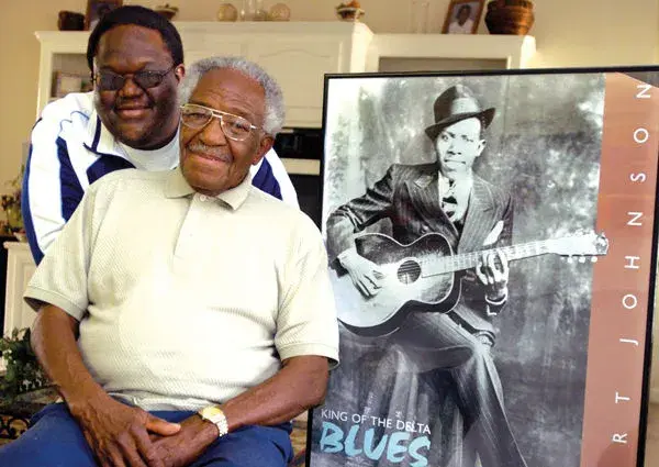 Claud Johnson, seated, son of legendary Mississippi blues artist Robert Johnson, shown in the poster on the right, has died at age 83. Johnson, who posed in the 2006 photo with his own son Michael Johnson, won a legal fight in 2014 to keep the profits from the only two known photographs of his father.