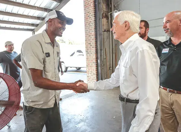 Smith Brothers Collision Center employee Lynn Coleman, left, shakes hands with U.S. Sen. Thad Cochran, R-Miss., during a Cochran campaign tour stop in McComb on Monday. State election officials approved a November ballot that lists Cochran as the Republican nominee despite an ongoing challenge to Cochran’s Republican primary victory.