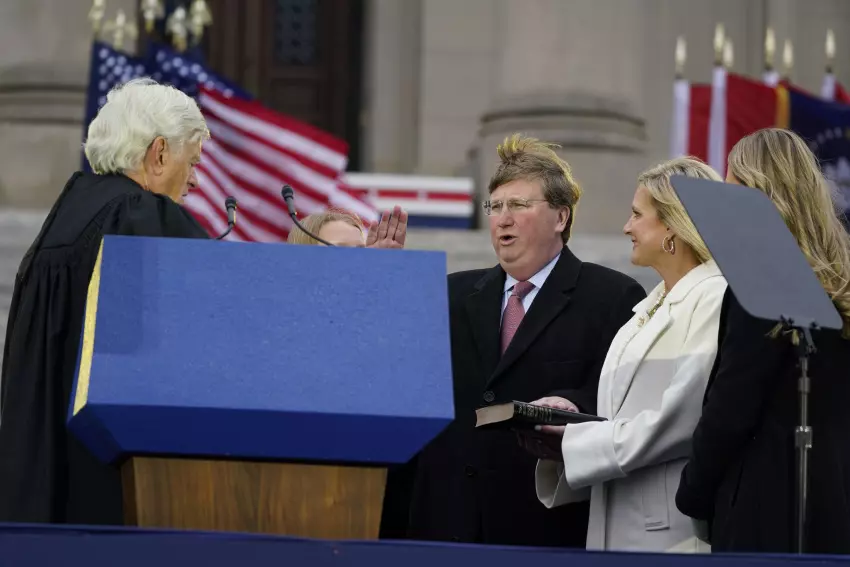 Jolynn McLellan White, second from right, holds the Bible as her husband, Rep. Jason White, R-West, left, recites the oath of office as House Speaker for the Mississippi House of Representatives, delivered to him by Rep. Trey Lamar, R-Senatobia in the Mississippi State Capitol in Jackson, Miss., Tuesday, Jan. 2, 2024. Both chambers of lawmakers were sworn into the new four-year term that began at noon Tuesday. (AP Photo/Rogelio V. Solis)