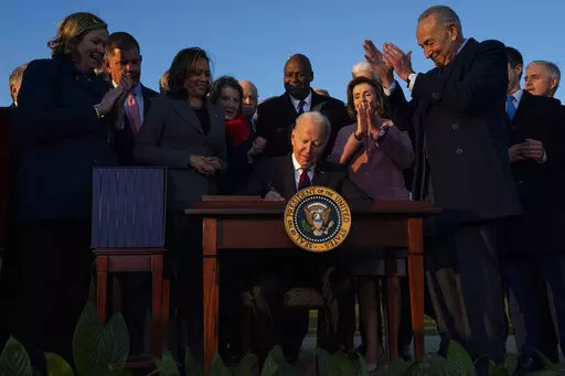 Claudia Cedillos, left, waves signs with her daughter Montserrat before a campaign rally for Democratic presidential candidate former Vice President Joe Biden, on Nov. 2, 2020, in Miami. Just over a year ago, millions of energized young people, women, voters of color and independents joined forces to send Joe Biden to the White House. But 12 months after he entered the Oval Office, many describe a coalition in crisis. (AP Photo/Lynne Sladky, File)