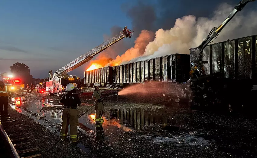 A firefighter sprays crossties with water after a crane lowers them from flaming freight train hopper cars to the ground near Swan Lake Tuesday night, June 6, 2023. Four Canadian National Railway cars hauling railroad crossties were involved in the fire. (Photo by Robert Riley)