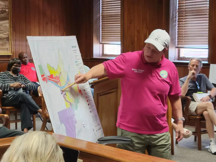 Greenwood Community Development Director Betty Stigler showed a zoning map to the Greenwood City Council on Tuesday. The map, which includes churches, schools and day cares, will help the council in determine where potential medical marijuana dispensaries can be located. (By Kevin Edwards)