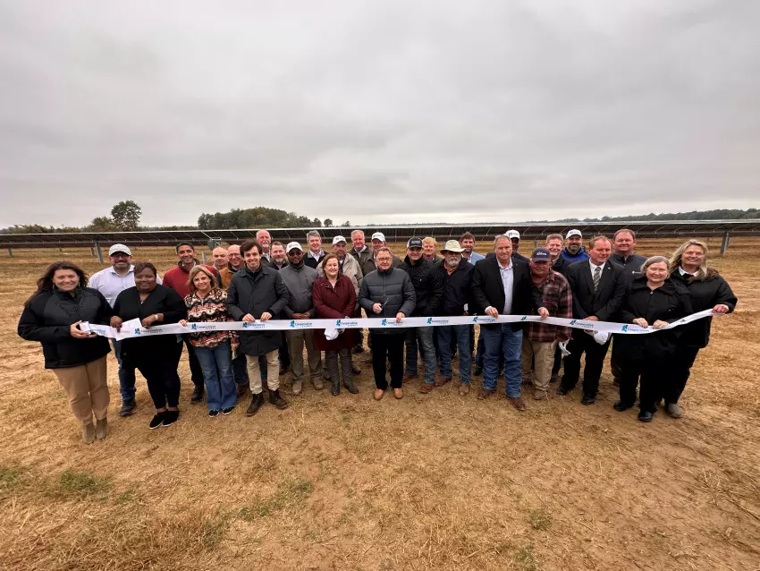 A ribbon-cutting and celebration were held Monday for the large-scale solar operation at Delta’s Edge, Cooperative Energy’s newest utility-scale solar site, located in Carroll County six miles east of Greenwood. At center, David O’Bryan, general manager of Delta Electric Power Association, gets ready to cut the ribbon.