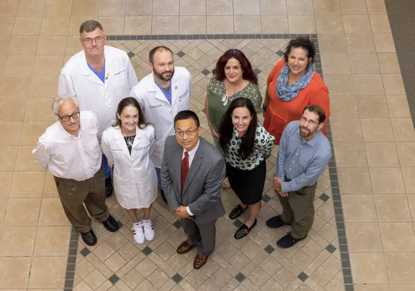 (Photo by University of Mississippi Medical Center) Dr. Lei Zhang, center, joined by co-investigators on the Violence Injury Prevention program, left, and Intimate Partner Violence Initiative, right. Pictured are, front row, from left, Dr. Bill Hillegass, Dr. Laura Vearrier, Zhang, Dr. Erin Dehon and Dr. Andrew Voluse. Back row, from left, are Dr. Carl Mangum, Dr. Matthew Kutcher, Dr. Masoumeh Karimi and Tara Price.