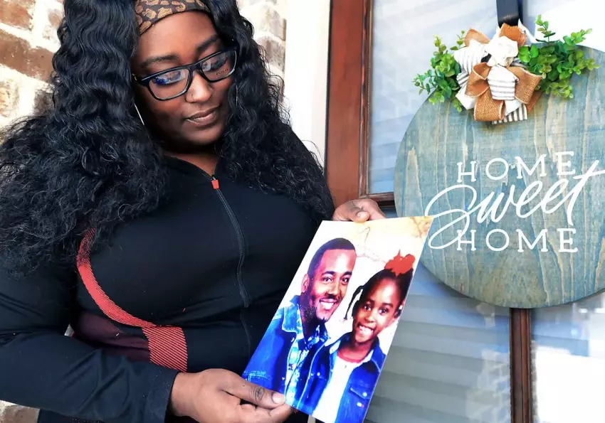 Ferlandria Porter of Canton, holds a photograph of her 5-year-old self and her father, Ferlando Esco, Tuesday, Jan. 30, 2024. Esco has been incarcerated for nearly 20 years. Porter is advocating for a law that would allow habitual offenders to be eligible for parole. Credit: Vickie D. King/Mississippi Today