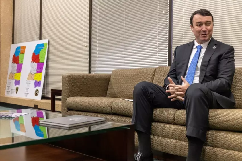 Mississippi Department of Public Safety Commissioner Sean Tindell discusses proposed House Bill 448 at his office in Jackson, Miss., Tuesday, January 24, 2023. The bill could prohibit video recording law enforcement from a certain distance. Credit: Eric Shelton/Mississippi Today