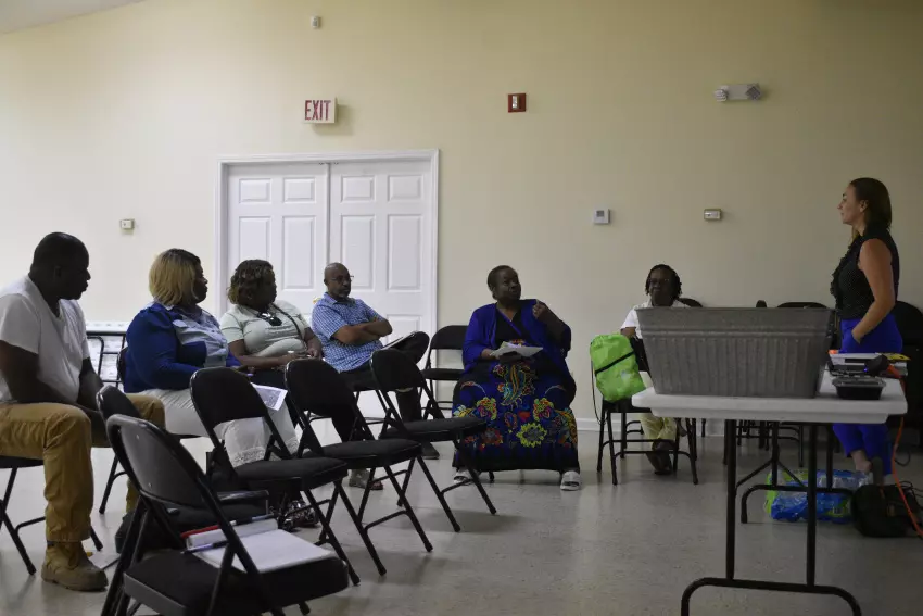 During a meeting Friday afternoon in Itta Bena’s Brazil Center, various city representatives and a few citizens met with Emily Roush-Elliott of Delta Design Build Workshop in Greenwood to discuss an updated strategic plan for Itta Bena. From left are Ward 3 Alderman Darrick Hart, Patricia Young, Ward 2 Alderwoman Kim Dawson, Tracy Johnson, Ward 1 Alderwoman Jennifer Walker, Dee Jones with Hope Credit Union and Roush-Elliott. (By Katherine Parker)