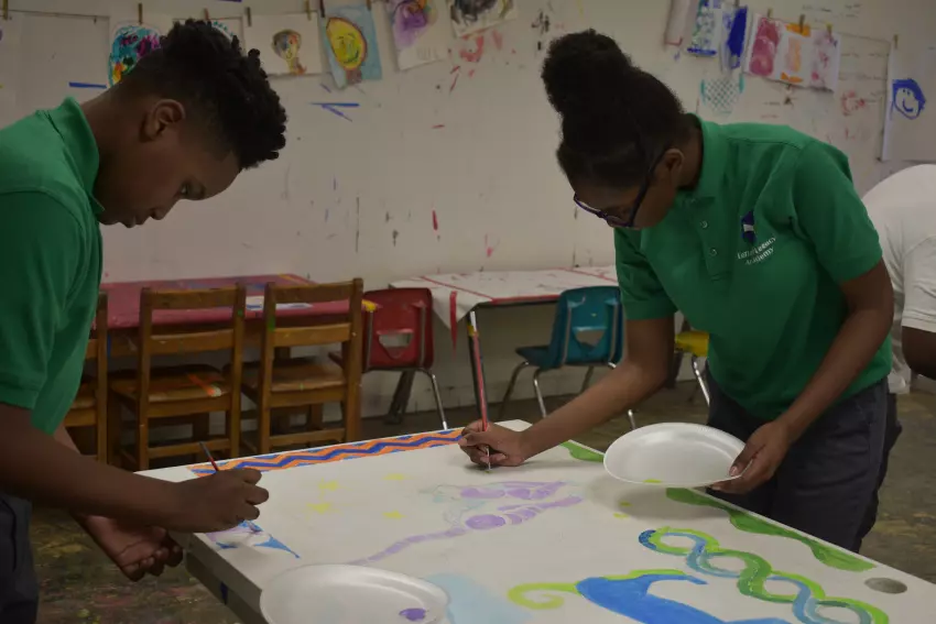 Joshua Magee, left, and Zakyln Odell, both 13-year-old students at Leflore Legacy Academy, work on the mammal mural door at ArtPlace Mississippi under the tutelage of Leslie Turner, artist in residence at Delta Arts Alliance in Cleveland. (By Katherine Parker)