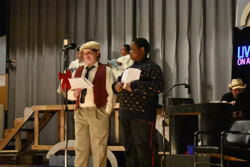 Lydia Jacobs-Stagner, 11, left, rehearses her part as young George Bailey in the Greenwood Little Theatre’s production of “It’s a Wonderful Life: The Radio Play.” To the right is Blessyn Thomas, 11, who plays Tommy, George Bailey’s son, and young Harry, Bailey’s brother. (By Katherine Parker)