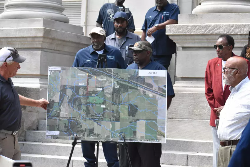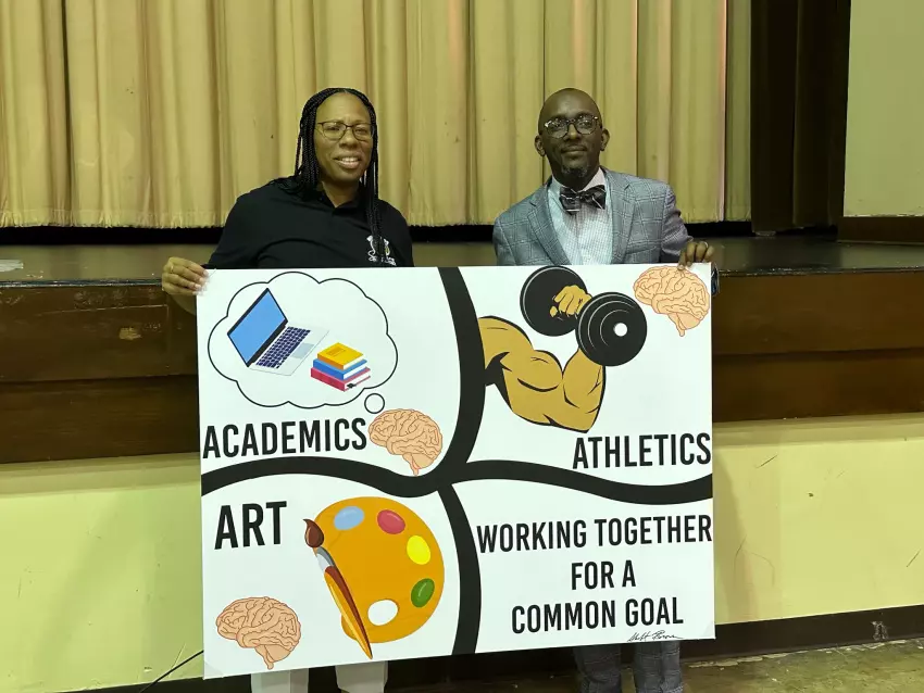 Dr. Likisha Coleman, left, an assistant superintendent in the Greenwood Leflore Consolidated School District, and Shaft Brown, an educational consultant who is also the founder and CEO of Ednet Connections, display a poster representing some of the district’s focuses for the 2023-2024 school year. (By Katherine Parker)