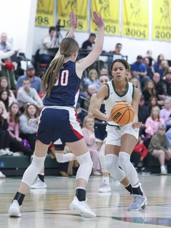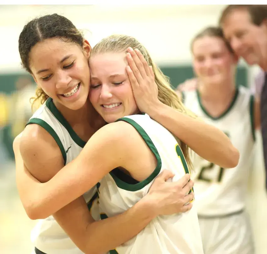 Pillow Academy's Alanna Hodo, left, hugs teammate Izzy Hodges, center, after defeating Leake Academy 46-37 in Saturday's consolation game of the MAIS Class 5A State Tournament, which was hosted by Pillow. Jane Kimmel Buford, third from left, is hugged by Pillow head coach Durwin Carpenter. (By Andy Lo, Copyright 2025 Emmerich Newspapers, Inc.)