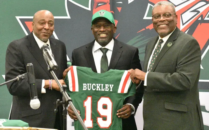 Terrell Buckley, center, was introduced as Mississippi Valley State’s 19th head football coach on Monday. Pictured with Buckley are interim athletic director George Ivory, left, and university president Dr. Jerryl Briggs. (By Jared Conerly, Copyright 2025 Emmerich Newspapers, Inc.)