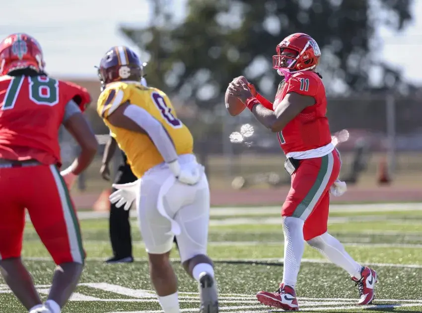 Pillow Academy sophomore quarterback Tate McLellan eyes a Washington School defender during the first half of Friday night’s battle with the Generals at Bill Davis Field. McLellan and the Mustangs went on to win 41-14 and finish the season 3-7 overall. (By Andy Lo, Copyright 2024, Emmerich Newspapers, Inc)