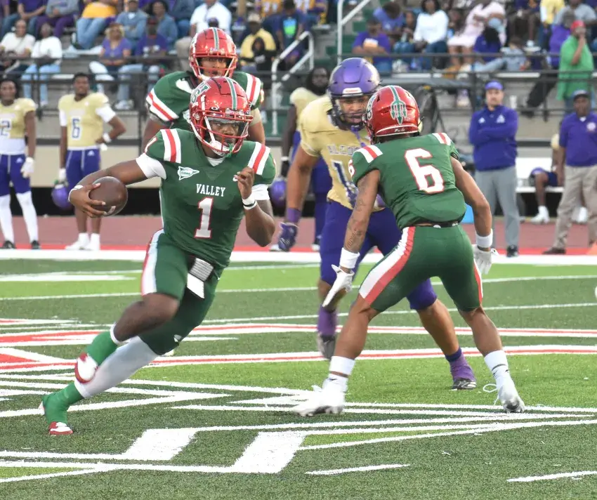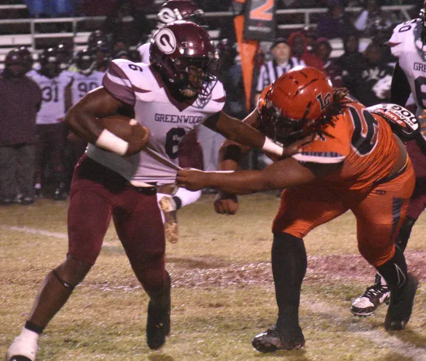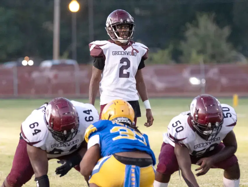 Greenwood High School quarterback Javion Meeks (2) looks over the line of scrimmage against Amanda Elzy on Sept. 20 as linemen Cedric Shelby (64) and Michael Shelly (50) get ready to block Taeveyon Strong. (By Marcus West, Copyright 2024 Emmerich Newspapers, Inc)