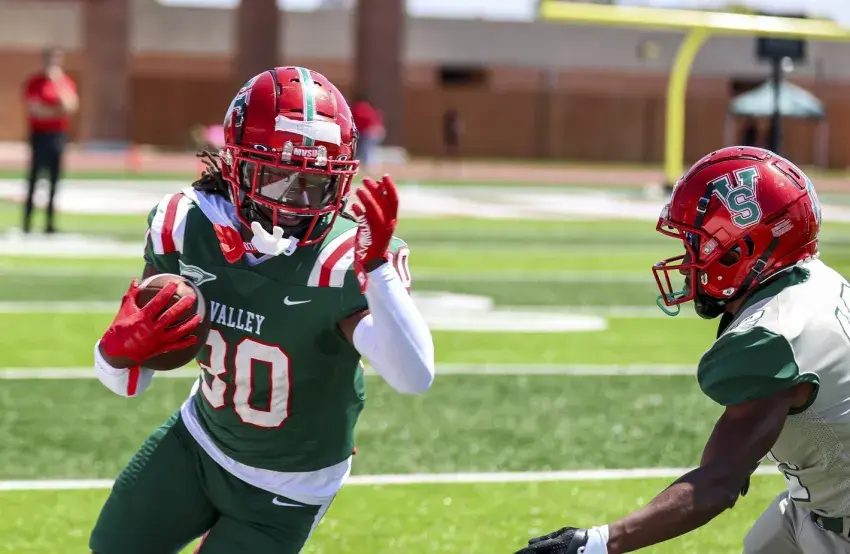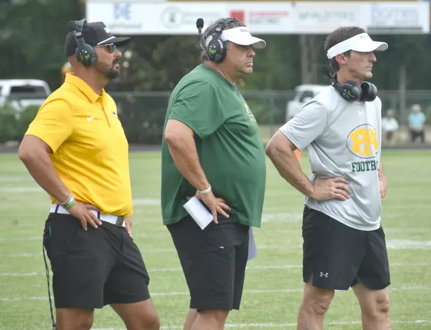 Pillow Academy head coach T.J. Davis, left, offensive and defensive lines coach Bo Milton, center, and defensive coordinator Clete Putnam watch Pillow Academy during its 28-15 spring game win over South Pontotoc High School on Friday at Bill Davis Field. (By Jared Conerly, Copyright 2025 Emmerich Newspapers, Inc.)
