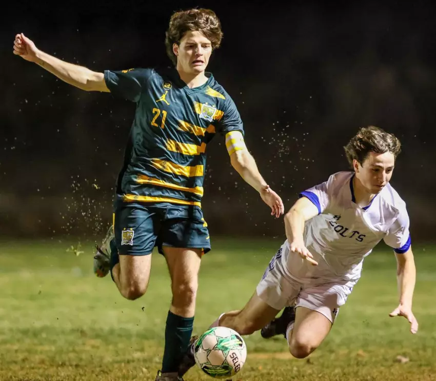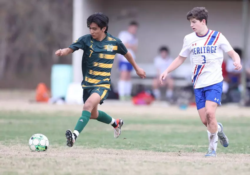 Pillow Academy’s Kevin Hernandez (7) races past a Heritage Academy defender during a 1-0 win over the Patriots in Thursday’s MAIS Division II quarterfinals. Hernandez, the Mustangs’ all-time goals leader, scored the lone goal in the game. (By Andy Lo, Copyright 2024 Emmerich Newspapers, Inc)