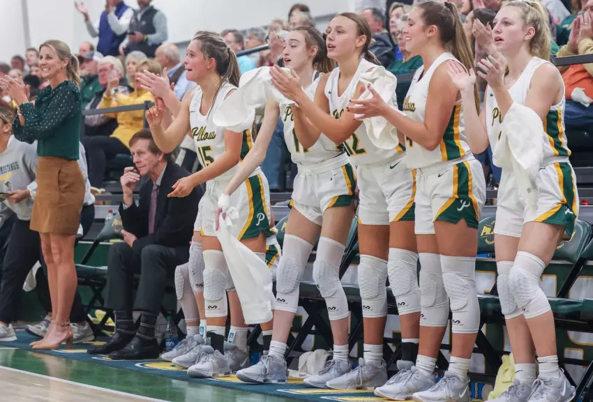 Pillow Academy basketball players and coaches cheer on the team from sidelines on Nov. 30. From left are assistant coach Mignon Hodges, head coach Durwin Carpenter, Lola Harris, Sydney McIntyre, Mason McLellan, Tavi Layne Johnson and Ann Rogers Crowder. (By Andy Lo)