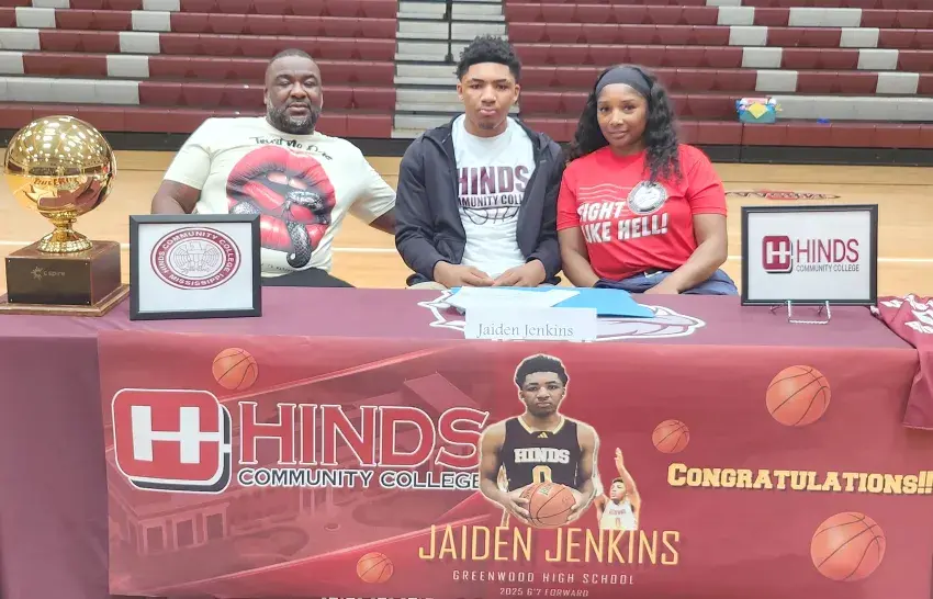 Greenwood High School’s Jaiden Jenkins, center, signed to play basketball at Hinds Community College on Tuesday inside the Bulldogs' gym. Jenkins is joined by his father, Jeremy Jenkins, left, and his mother, Jennifer Venable. (By Jared Conerly, Copyright 2025 Emmerich Newspapers, Inc.)
