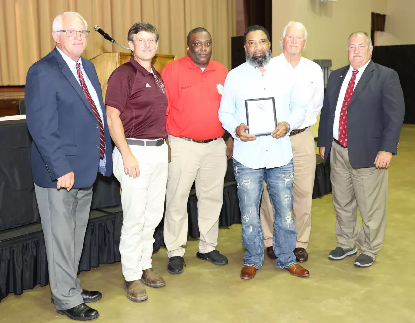 The Greenwood High School football team that made it to back-to-back state title game appearances was honored Saturday night at the Greenwood-Leflore Hall of Fame banquet. Representing the team with hall of fame board member Charles Cooley, from left, are coach David Bradberry, Jay Burleson, Cooley, Andre Washington, Mike Martin and Kelly Heath. (By Andy Lo)