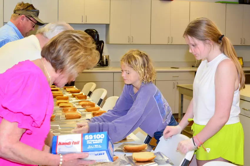 From left, Justin Hodges, Dexter Walcott, Annie Smith, Aspen Mize and Hyatt Hodges work in the kitchen at St. John’s United Methodist Church in Greenwood to make hot dogs that will be distributed to needy families and individuals as part of You Matter Ministries, which provides the service weekly. (By Dan Marsh)