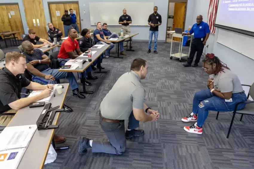 Mississippi Highway Patrol Trooper Sy Holley, center, and Latesha Wells, case manager with Hinds Behavioral's Mobile Crisis Response Team, right, participate in a psychiatric call simulation during a training session at the Mississippi Law Enforcement Officers Training Academy in Pearl, Miss., Friday, July 30, 2023. Credit: Eric Shelton/Mississippi Today