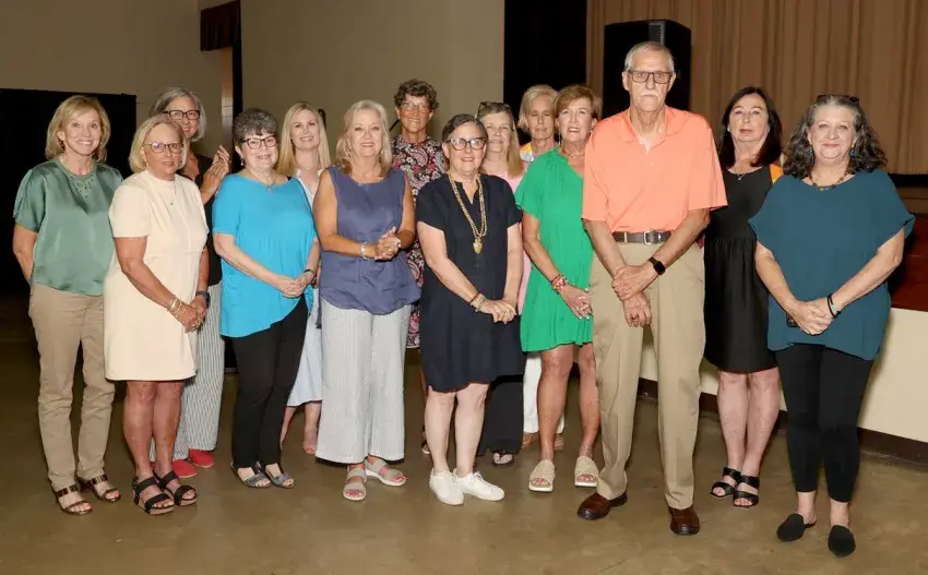 The girls basketball teams that helped Pillow Academy win 100 consecutive games from 1971 to 1974 were inducted into the Future Champions Greenwood-Leflore Sports Hall of Fame Saturday. Representing the teams as former players are, front row from left, Pam Makamson Bush, Donna Stowers Pittman, Susan M. Morgan, Eve Bell, Gwen Wier Toomey, Dee Dee Thach, coach Charlie Wright, Annette Tribble Morgan, Jonni Webb; in back, from left, are Melissa Wasson Barrett, Dana Barry Smith, who is representing Mildred Utroska Barry, Susan Lennard Smith, Ella Brunson Pogue and Key Crump Britt. (By Andy Lo, Copyright 2024, Emmerich Newspapers, Inc)