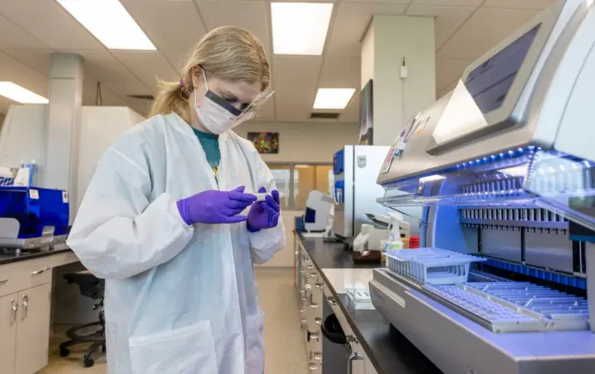 Forensic scientist Jenn Odom operates an automated DNA extraction instrument at the Mississippi Crime Laboratory in Pearl, Miss., on Wednesday, April 2, 2025. The system processes up to 24 samples in about 17 minutes using silica-coated magnetic particles to capture and purify DNA through a series of washing steps. Credit: Eric Shelton/Mississippi Today