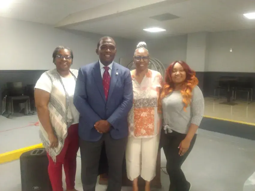 Leflore County interim Circuit Clerk Johnny Gary Sr., center, and his staff were the featured guests of the Greenwood Voters League meeting Wednesday at the Elks Hall. Joining Gary are, from left, Renolda Hart, Minnie Roby and Jasmine McClung. (By Jeff Byrd, Copyright 2024 Emmerich Newspapers, Inc.)