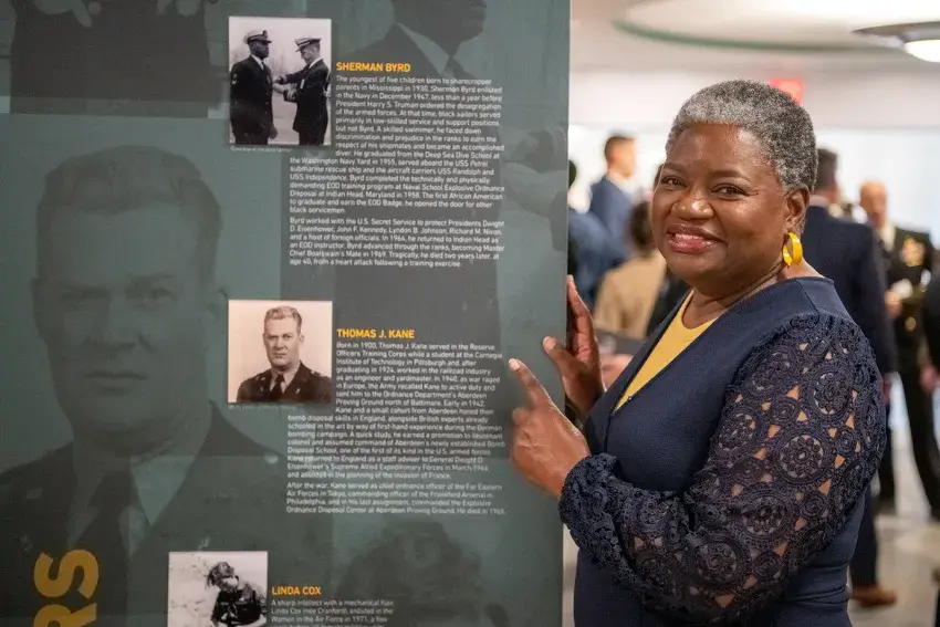 Cynthia Byrd Conner, daughter of Sherman Byrd, the first African American Explosive Ordnance Disposal (EOD) technician, attends the Pentagon EOD corridor exhibit unveiling in Arlington, Virginia, in April. The EOD Exhibit is the first and only exhibit of its kind in the Pentagon and represents the history, mission, culture, and tools of the Joint EOD Force. (Photo by U.S. Army/Christopher Kaufman)