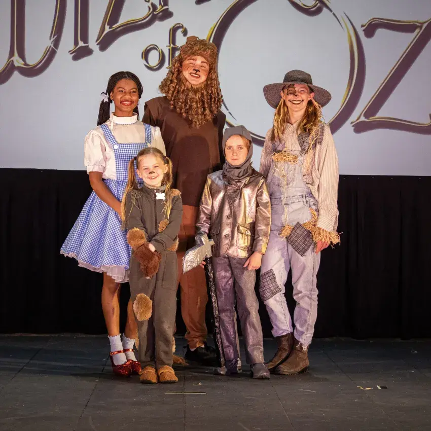 The cast of Greenwood Little Theatre’s production of “The Wizard of Oz” includes, from left, Michelle Greene as Dorothy, Cecilia Hinckley as Toto, Charlie Kimmel as the Cowardly Lion, Isaac Dallas as the Tin Man and Sophie Owens as the Scarecrow. (By Alicia Dallas)
