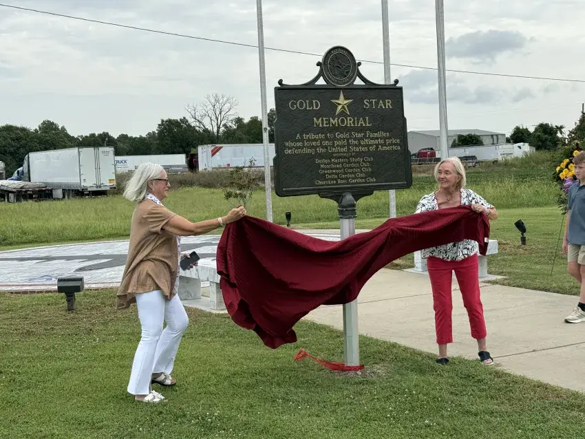 A Gold Star memorial was unveiled at the YANKY 72 memorial service Saturday, honoring the families of 15 Marines and one Navy Corpsman. Past president of the Mississippi Garden Clubs, Melinda Causey, left, and the organization’s current president, Sassy Mauldin, unveiled the memorial. (By Taylor Thompson, Copyright 2025 Emmerich Newspapers, Inc.)