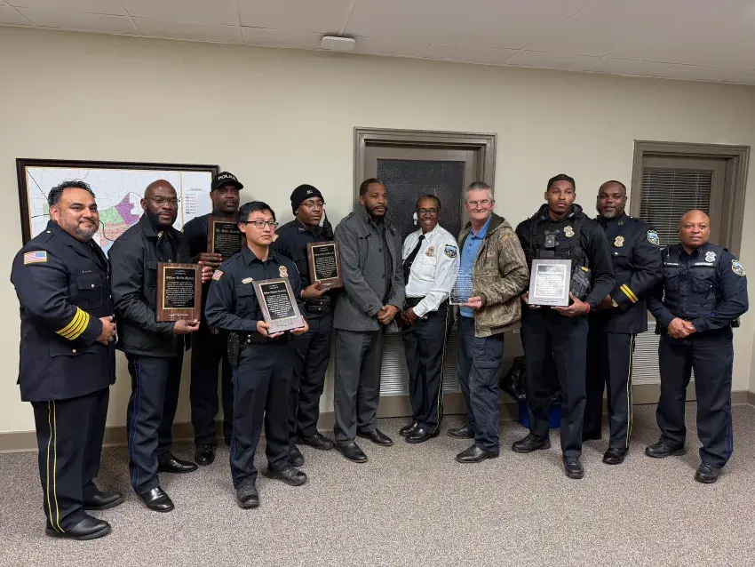 Six Greenwood Police Department officers received plaques during Tuesday’s Greenwood City Council meeting. From left are Police Chief Serafin Simon Jr., Officer Hollis Myrick, Lt. John Newton, Officer Domingo Hernandez, Officer Patrick Johnson Jr., Mayor Kenderick Cox, Deputy Chief Talisha Leach, Sgt. Bryan May, Officer Tommie Cotton, Capt. Edgar Gibson and Lt. Tony Collins.