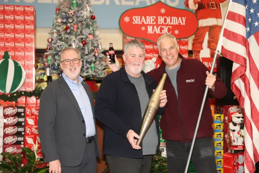 The Greenwood Market Place was awarded an official Olympic Torch Monday for its placement in a Coca-Cola competition. From left to right: Brad Davis, senior director of global accounts at The Coca-Cola Company; Derrick Simpson, manager of Greenwood Market Place; and David “Jackson” Mueller of Market Place. (By Andy Lo, Copyright 2024 Emmerich Newspapers, Inc.)