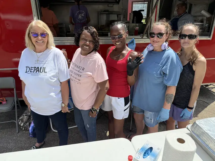 Depaul USA's "ROOTS" program in Greenwood held a fish fry fundraiser Monday in the North Greenwood Baptist Church parking lot, featuring food provided by Larry's Fish House. The ROOTS program helps recently incarcerated women enter society again through transitional housing and supportive services. From left are Kathy Johnson, director; Angie Woods, case manager; Yoshi Carter, resident manager; and residents Miranda Alford and Lucy Roane. The residents not pictured are Diana Anderson, Sarah Bassett and Rebecca Roberts. "The fundraiser went amazing," Johnson said. "All of the money goes toward the transitional home for women coming out of incarceration that would otherwise be homeless."