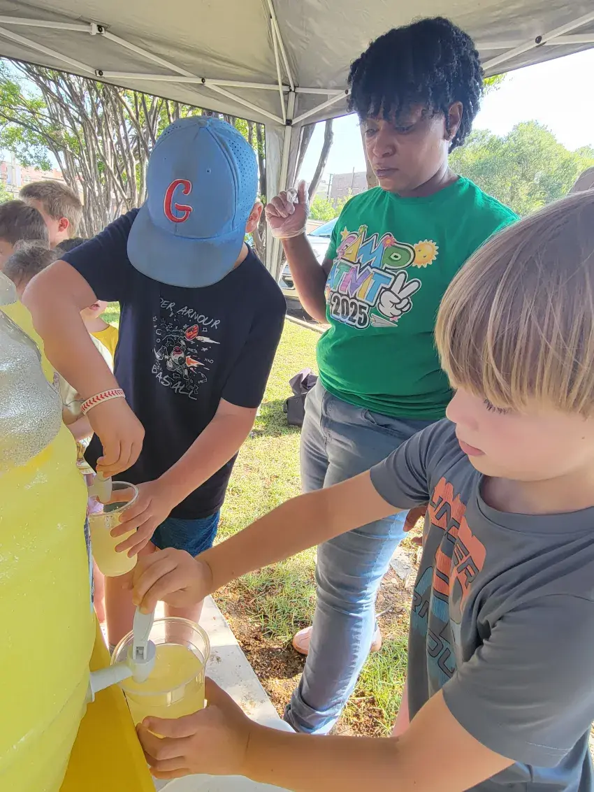 Children from the Episcopal Church of the Nativity’s day school prepared lemonade and baked goods Monday morning on Fulton Street. Right: Elias Gregory, left, and Lawrence Hodges, right, pour drinks while Jeneshia Self, center, makes sure all goes correctly. (By Kevin Edwards, Copyright 2025 Emmerich Newspapers, Inc.)
