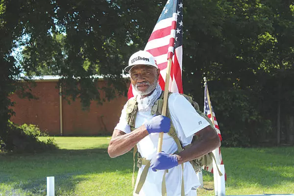 A Marine Corps veteran from Greenwood has been walking through downtown while carrying a large American flag.