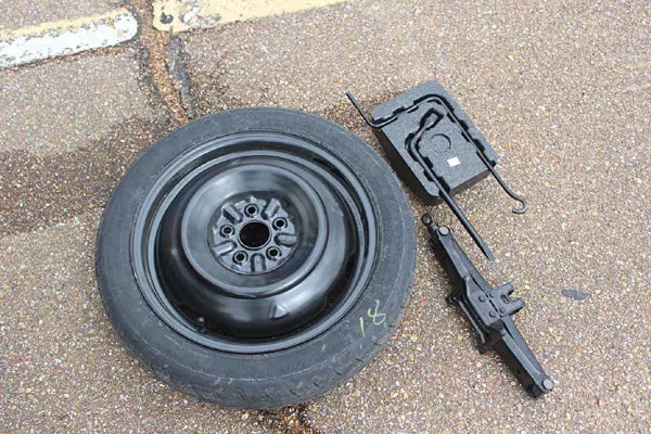A car’s spare tire kit, as shown, usually includes a spare tire, a wheel nut wrench and a jack and jack handle. Other useful items to have on hand include a rubber mallet, WD-40 spray lubricant, a bike pump, a tire pressure gauge, a flashlight and a piece of cloth or wire brush.