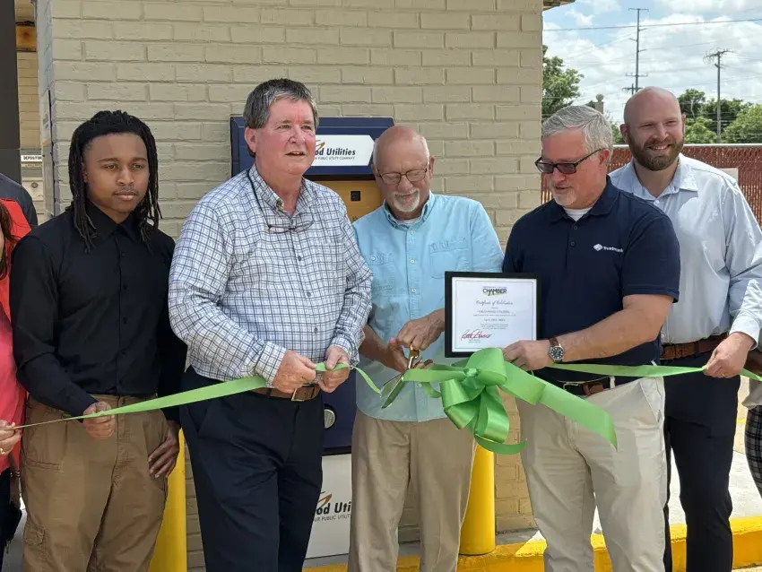 Greenwood Utilities opened a kiosk Tuesday that will be open around the clock for its customers. The kiosk, located at 101 Wright Place, accepts payments by cash or card. From left are Marquii Washington, customer service intern at Greenwood Utilities; Brian Finnegan, CEO; Jimmy Horn, contract employee; Hugh Warren, president of Trustmark Bank in Greenwood and former president of the Greenwood-Leflore County Chamber of Commerce; and Blake Magee, Greenwood Utilities’ chief financial officer. Finnegan said the kiosk was a year in the making. “There’s been a lot of thought that went into short cars, large trucks. We want this to be a good experience for all of our customers,” he said at the ribbon cutting ceremony held by the chamber. He thanked the local businesses that worked on the project, including Rozier Construction, Hammons & Associates and Ainsworth Signs. (By Taylor Thompson, Copyright 2025 Emmerich Newspapers, Inc.)